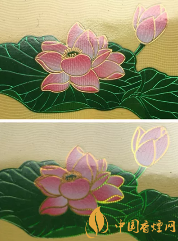 真品卷煙商標紙上的荷花花瓣采用漸變技術,顏色由粉紅色向白色過渡,花蕊處金色線條清晰,圖案印刷自然協(xié)調,立體感強;假煙采用普通仿制技術,顏色搭配較為死板,花蕊處金色線條模糊、擠成一團,圖案印刷粗糙、立體感差。