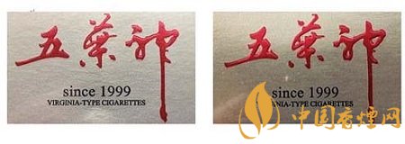 真品卷煙:“五葉神”字體筆畫流暢自然,套印準(zhǔn)確,筆畫基本無(wú)凸起,字體筆畫顏色為鮮紅。