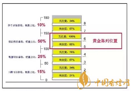 在同一組貨架上,因?yàn)轭櫩妥⒁暤姆绞讲煌圆煌惲形恢卯a(chǎn)生的銷量會有不同的變化,一般來說,與視線平齊的位置陳列的商品銷量最高,而顧客需要仰望和蹲下才能注視的商品銷量相對要低。