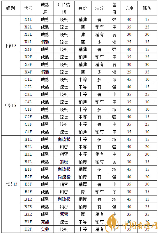 下低等煙:上檸四B4L、下檸三X3L、下檸四X4L、下桔四X4F、光滑二S2、中下雜一CX1K、中下雜二CX2K、上雜一B1K、上雜二B2K、上雜三B3K、青黃一GY1、青黃二GY2。