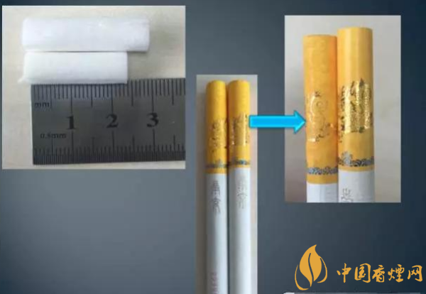 假冒卷煙:接裝紙長度32mm,印刷效果不清晰,色澤暗淡,濾棒長度28mm。