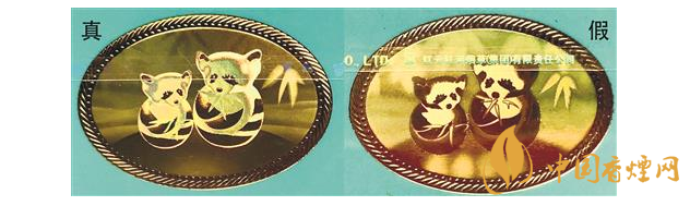 鐳射防偽標(biāo)識差異對比:真煙鐳射防偽標(biāo)識清晰、無漏色,竹葉葉片清晰光滑無條紋,兩只小熊貓身上和頭頂?shù)拿旨?xì)均勻;假煙鐳射標(biāo)識粗糙模糊,竹葉葉片有條紋狀,兩只小熊貓有漏色,身上和頭頂?shù)拿植诓痪鶆颉?/p>