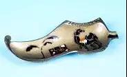 這款造型奇特的工藝煙灰缸來自以色列,為金屬質(zhì)地,外層漆金。整體造型為以色列特有的翹頭鞋,鞋跟處伸出一截短短的煙槽,鞋口則有陰刻的“JERUSALEM”(耶路撒冷)字樣;鞋身用簡(jiǎn)單的黑、紅、黃、白勾勒了具有明顯地域色彩的花紋,如回首的駱駝、椰樹、城墻等。整件作品的造型和色彩都帶有濃郁的中東風(fēng)情,高檔煙灰缸圖片十分別致。